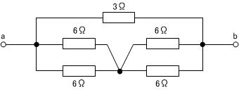 斜めに接続されていた6Ωの抵抗の接続点を、それぞれ横にずらしていっただけなのですが、こうすることによって、単純な抵抗の並列接続と直列接続の複合回路であることがわかります。 |