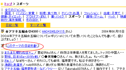 楽天広場【日記】のTOPページをみてみると、「注目!旬のテーマ」「盛り上がってるテーマ」など楽天広場内でよく投稿されているテーマが載っています。気になるテーマをクリックすると↓の画面がでてきます。