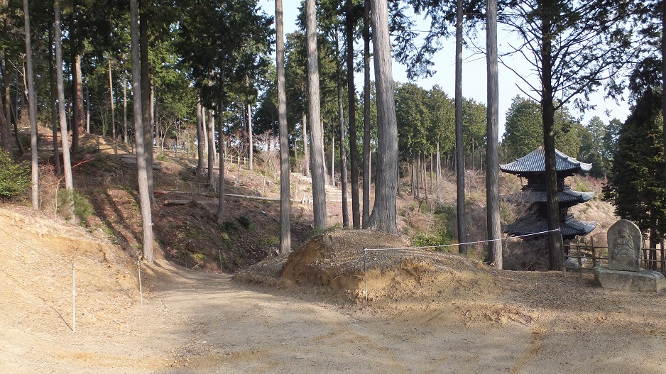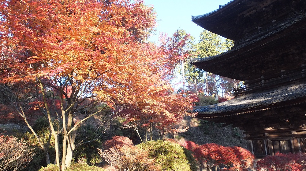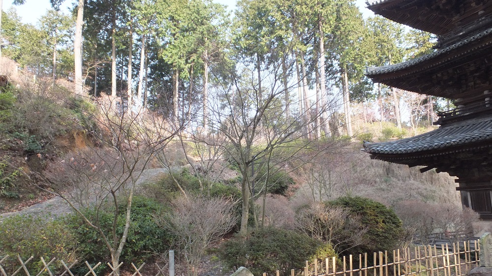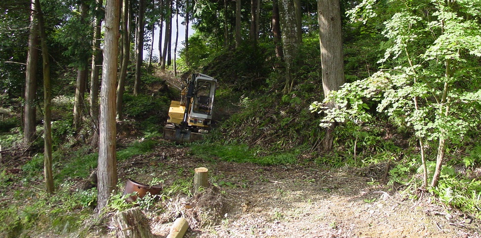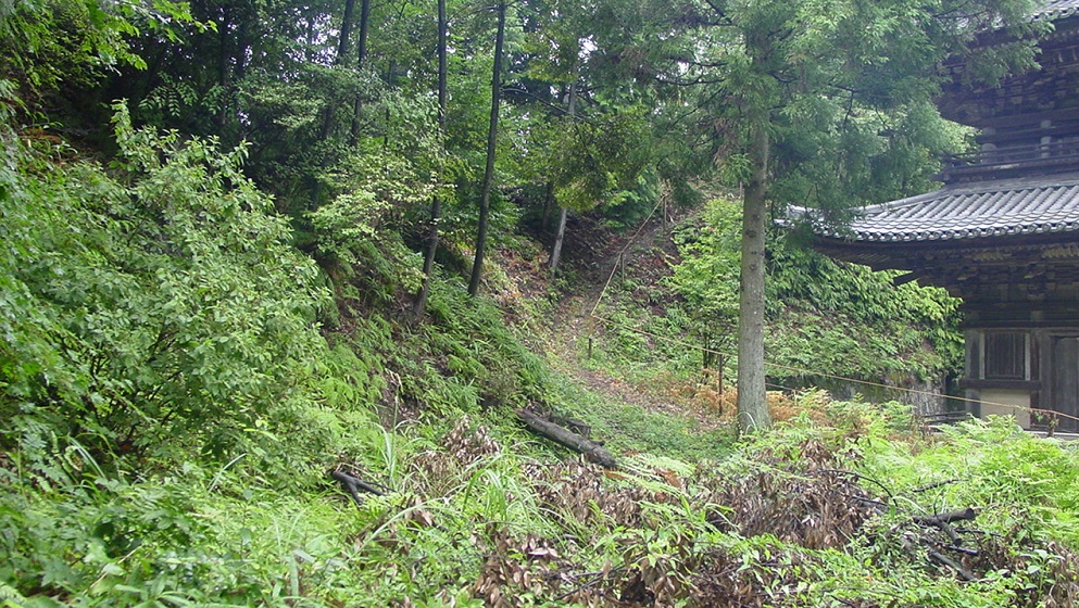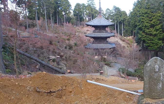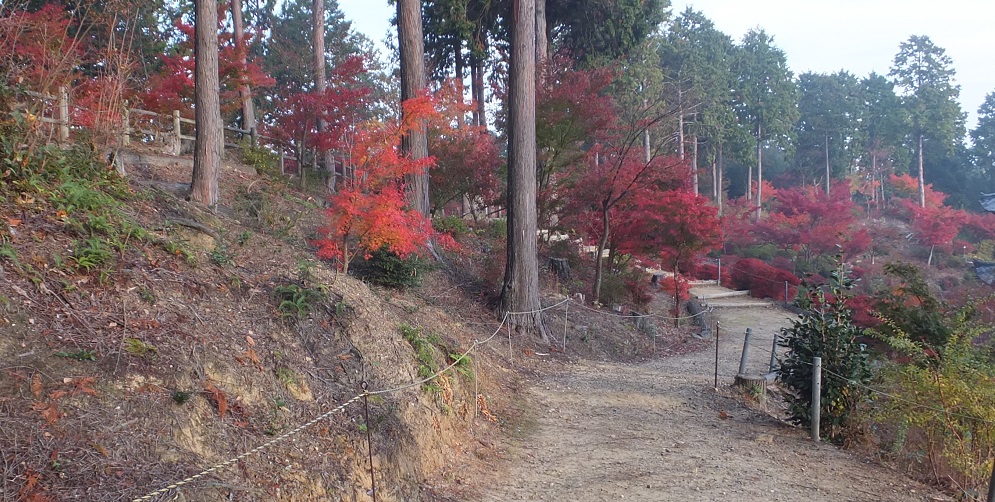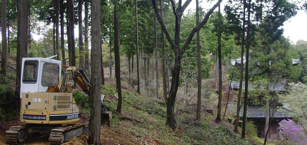 愚僧が住職になり、檀家の無い常楽寺は無収入であったので、サラリーマンをしながら寺院のお努めをしておりましたので土日以外の個人参拝の受付はしておりませんでした。それで20年近く手入れが行き届いていない裏山は荒れ放題でありました。平成17年秋の第1回特別公開を行うに当たり何とかせんと奮起、平成18年から毎年少しづつ境内整備をやり始めました。うっそうとした裏山の雑木をぼちぼ間伐、枝打ち、草刈り、中古のユンボを購入して整地し散策路造りと、間伐は420本、間伐した分モミジを400本植樹。また、ドウダンツツジは1,200本、平戸ツツジ1,000本植樹しました。いまだに整備途中です。