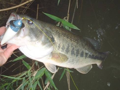 ●オーバーハングの下。マグナムトーピードのYFOの2アクションめに見事なヒット。よく引きました。ところがその後は全く反応なし。陽が上がってから、ナマズらしきヒットするもののすっぽ抜け。続いて沈み枝の際でもヒット。今度は乗りましたがきっとナマズだろうと追い合わせしないでいると、ジャンプ一発で逃げられてしまいました。・・・バスでした。ペラもの用に使っているGO103(初期型の長いもの)、まさに素晴らしい竿なのですが、合わせが効きにくいのが少々難点です。