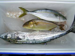 60cm)、マダイ(TL 62cm)といろいろと楽しめました。マダイは、ベテランさんの竿に掛かったのをご厚意で釣り上げさせていただいたものですが、大きいだけあってトルクのある引き味を堪能しました(クーラーのはさらに大きな72cmのマダイです)。