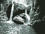 どうも沢登りの若者グループらしく、飛び込みたいが釣り人が居るので困っているようである。 ここは若者に譲ろうと思いルァー竿を仕舞い始めるとさつそく一人が左岸の岩の上に立った。 1、2、3、と数える間も無く若者の姿が消えた、約2秒後に白泡の直ぐ手前にバンダナを巻いた頭が水面に出た。 良かった 良かった! 思わず胸を撫ぜ下ろした。 後の二人も次々に躊躇も無く滝つぼに身を躍らせた。 すごい!