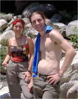 水面に真夏の陽射しが差し込み始めたためか、喰いは渋く当たりが殆ど無い。 しかし、遠来のお客さんには何とかあまごが来るように願いながら遡行をした。 私の心配を他所に、彼の竿がメンバーの中で最初に曲がったのは、固有の技術差なのだろうか・・・ とにかくこれで一安心である。 途中で石の上に女性の水着等が沢山並べてが干してあるところに着いた。 一体これは何だろうと思っていたら。横の木々の間よりキャンプしている外国人ペァーが覗いた。 英会話が全く出来ない私は、果敢にも関西弁で色々尋ねてみるが殆ど通じないようであった。 それをFT君が流暢な英語で聞いてくれるのであった。 また彼らの返事はFJ君が正しい東京弁で訳してくれた。何とすばらしい弟子達であろうか・・・? いやいや私の人徳であろうか・・・。 それは無いと弟子は直ちに口を揃えて反論すると思われるが・・・。 最後に野猿に初めて乗り童心に返った。外国人ペァーにも野猿に乗ってもらったが結構楽しそうであった。