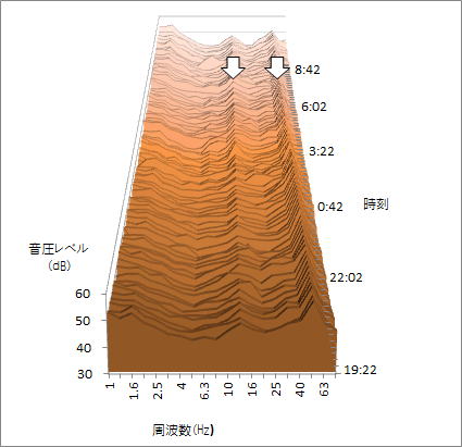 19時から翌9時ごろまでの測定ですが、この間、ピークが途切れることなく、一定の音圧で長時間継続し、特に静かな夜間では心身に苦痛を与えます。低周波音はもちろん自然音にもありますし、家庭用冷蔵庫やエアコンからも発生します。しかし、冷蔵庫やエアコンはこのように連続して稼働することはありません。弱い音圧レベルでも途切れることなく、24時間ほぼ年中無休で動き続けることで、被害が生じます。 |