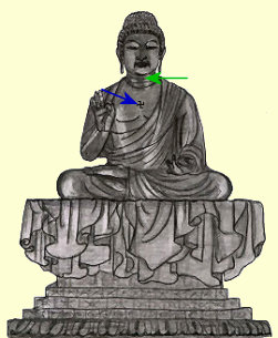 「白亳(びゃくごう)相」(緑矢印)とは眉と眉の間で額の中央の眉間に一丈五尺(4.5 |