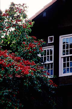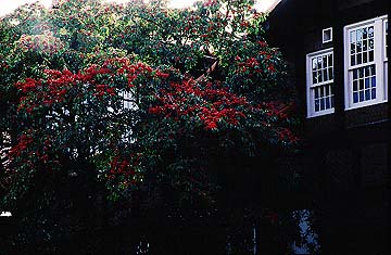 裏のほうから美術館を眺めると大きなピラサンカの赤い実がきれいです。
