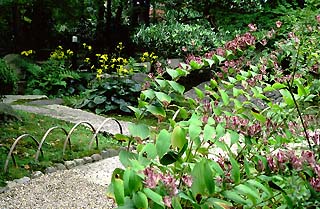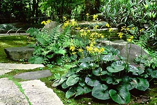 紅葉の前、ほととぎす、ツワブキが咲いています。