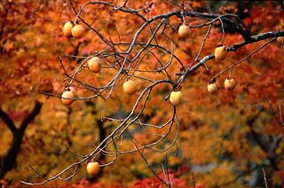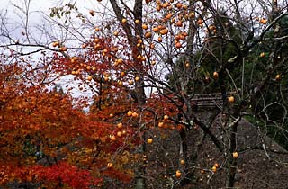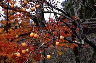 わらぶき屋根に柿と紅葉がこの季節の風景です。