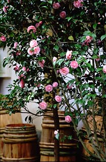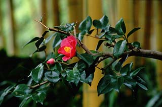 黄金色の竹と椿の花のコントラストをお楽しみ下さい。