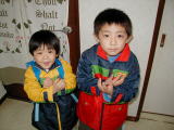 | 2月3日 今日は節分。豆をまいて鬼を追い払うということなのですが、だれが鬼になる?ということになると、何故か全員一致で私だと言います。ユーマは幼稚園で鬼の扮装を作ってきているのだから、ユーマに水を向けるのですが、いやなようですね。昔は鬼の面をかぶっただけでカズは泣き出したものですが。今日はどうなることでしょうか。 下の写真を取っている最中に、やんちゃるもんちゃの母は、キャーと大きな悲鳴を上げながらカメラを落としてしまいました。壊れはしなかったのですが、もう、何度目になるのでしょうか、進歩の無い母です。 |
