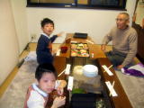| 1月2日 昨晩姫路に帰ってきた後は眠るカズをおんぶして家内の実家にお泊りです。朝から、立派なお節をいただいて、またまた親子ともども贅沢をさせていただきました。一日のんびりと過ごしながら百人一首やトランプ、UNOをしたりして子供たちも満足そうに過ごしておりました。 |