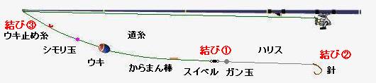 ウキ止め糸とガン玉は直接付けますから、通す順番は『シモリ玉』⇒『ウキ』⇒『からまん棒のゴム2つ』です。そして道糸をスイベル(直結ならハリス)と結び、ウキ止め糸、からまん棒を付けます。