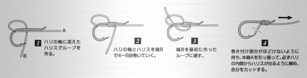 A 添えたハリスと軸を巻き込むよう4〜5回巻く