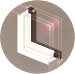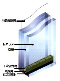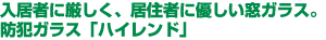 防犯ガラス「ハイレンド」は、通常2枚の板ガラスの間に強靭な特殊樹脂幕をはさみ、加熱圧着したガラスです。