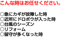 ドロボウ対策(ピッキング(鍵こじあけ)防止、ガラス強化、面格子、雨戸、シャッター)