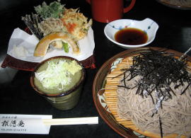 そばは、甘皮を一緒に引き込んだ粗挽きのもので、そばの香りの良い、素朴な田舎そばでした。とろろは、採りたての土の香りが残るもので格別!!天ぷらは、かぼちゃ、まいたけ、なす、しそ、かきあげ、ししとうの野菜天ぷらでした。
