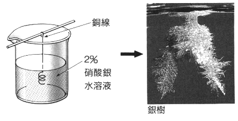 ・銅線を硝酸銀水溶液に浸すと、銅線の表面から黒いこけ状のものが出てくる、しばらくして結晶が成長してくると、銀白色の樹枝状の結晶になり、さらに成長していく。