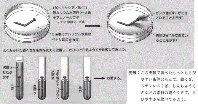 鉄がさびるときの化学反応は、どのような反応なのか、そのとき生じるイオンを指示薬により調べてみる。そのことからさびるときの化学反応を理解する。また、金属はどのような条件のときさびやすいかを鉄くぎを使って調べる。
