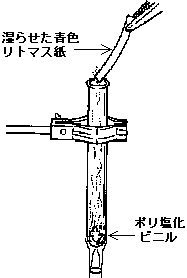 (3)ポリ塩化ビニルが燃焼すると塩化水素が発生することを調べる。試験管にポリ塩化ビニルの小片を入れ、ガスバーナーで加熱する。その試験管の口に、右図のように、水でしめらせたリトマス試験紙をかざして変色を観察する。