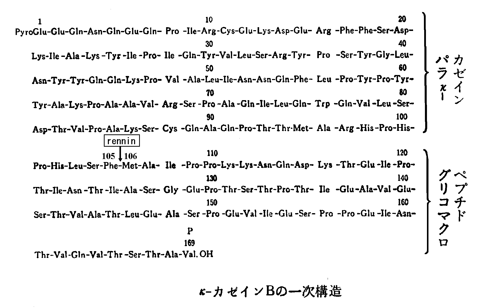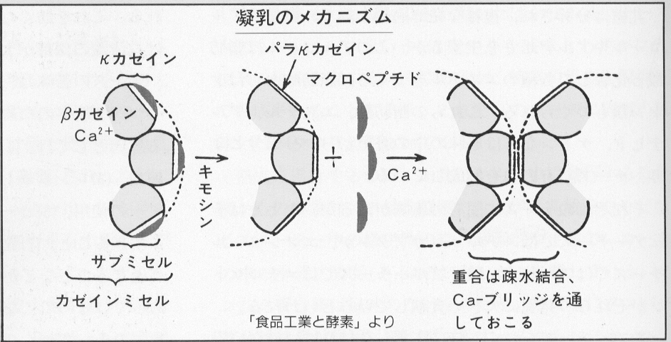 (3)それまでカゼインミセルを沈殿しないように保護していたκカゼインの親水性ポリペプチド鎖(グリコマクロペプチドと言われる)が分解により、ミセルから離れていく。あとに残ったκカゼインの分子鎖は、パラκカゼインと言われる。