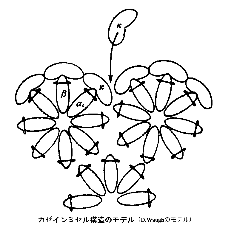 αS 群カゼインとβカゼインは、カルシウムイオンがあると結合し沈殿しやすい性質をしている。しかし、κカゼインはカルシウムイオンがあっても沈殿せず、水に溶ける。このκカゼインがカゼインミセルの外側を取り囲んでいて、カゼインミセルがカルシウムイオンの影響で結合・沈殿するのを防いでいる。