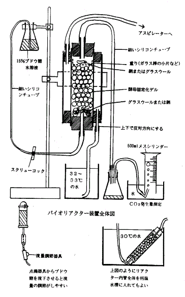 バイオリアクターを次ページの図のように設置し、サイホンの原理で15%グルコース水溶液を1分間に1mlの流速で送る。流速は、グルコース水溶液の位置(高さ)とスクリューコックの締め具合で調節する。