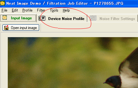 上のノイズ除去のところでファイルを開いた後(1)で「Device Notice Profile」をクリックしますが、その後で以下のように操作します。赤丸印のボタンをクリックします。