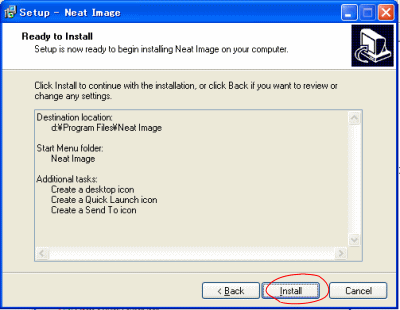 以下の画面はスタートメニューに「NeatImage」というフォルダーを作るかどうかの問い合わせですが、そのまま「Next」をクリックします。