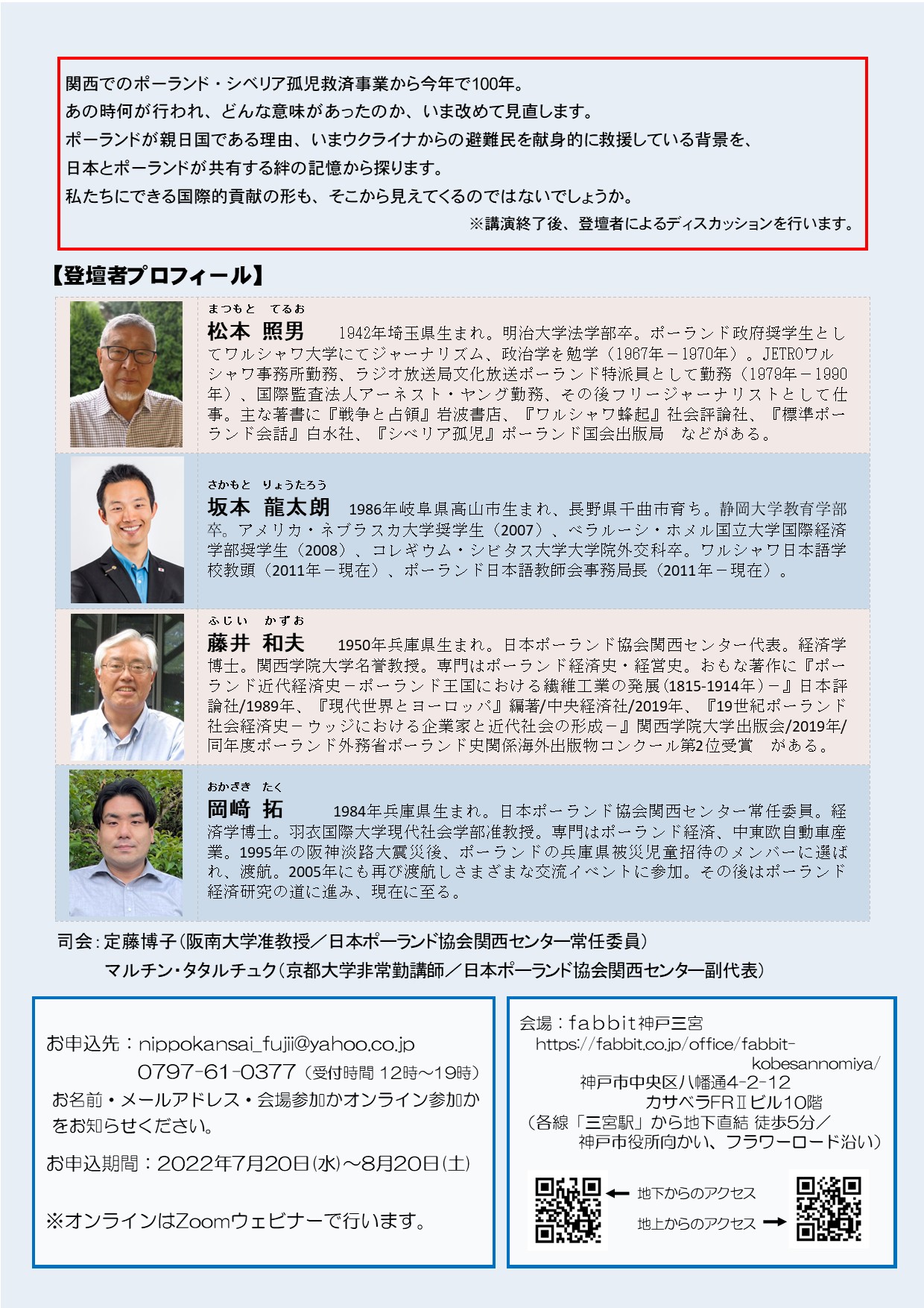 | 8月28日(日) ・講演会(対面・オンライン併用) 100年前の危機がつないだ日本・ポーランドの絆 ーポーランド・シベリア孤児 神戸出港100周年記念ー 「敦賀→大阪→神戸 孤児救済の歴史と国際親善」 fabbit神戸三宮イベントスペースにて ★アーカイブ視聴はこちら⇒ https://www.youtube.com/watch?v=vqHuaS6ByNU <助成> ![]() |