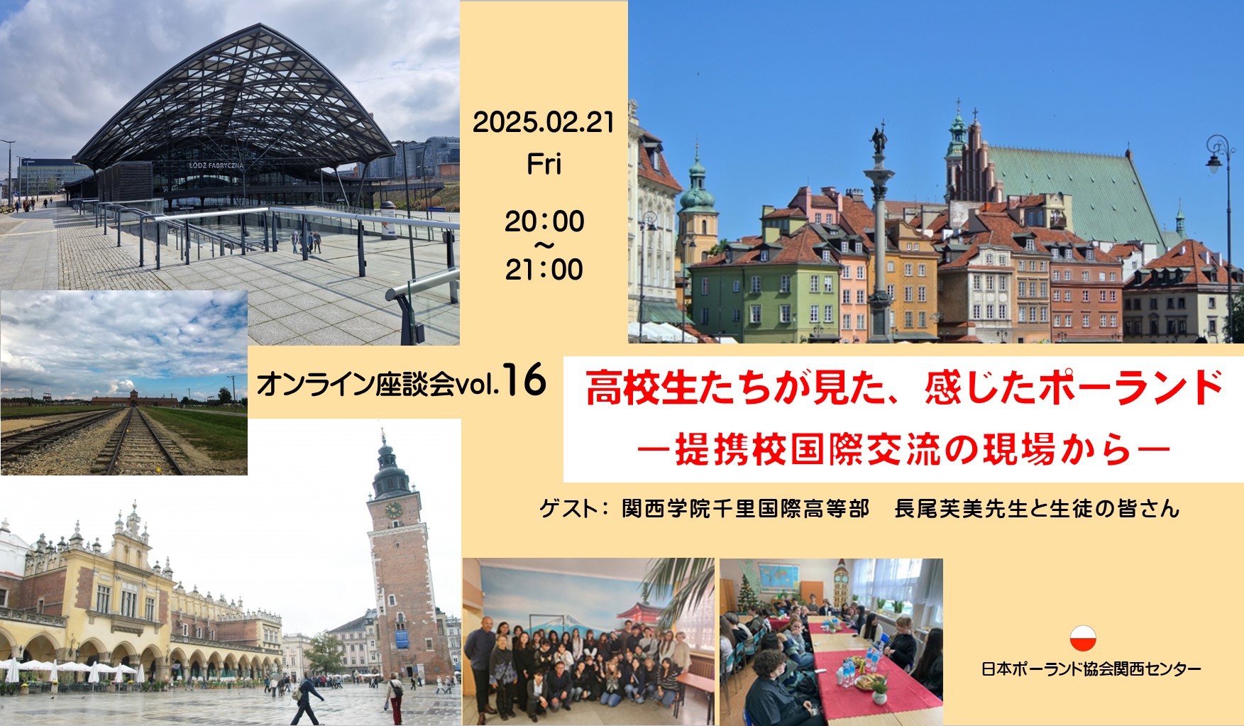 | 2025年2⽉21⽇(金) ・オンライン座談会vol.16 「 高校生たちが見た、感じたポーランド―提携校国際交流の現場から―」 ゲスト︓ 関西学院千里国際高等部 長尾芙美先生と生徒の皆さん Zoomミーティングによるオ ンライン開催 ★当日の様子はこちら ⇒https://www.facebook.com/nippo.kansai/posts/pfbid0rvExxfNBaFmiepV3DbRpr1VbpLRxHzdyA4uQFN4LLtrm7XDfzZxue87Tr7rXL46cl |