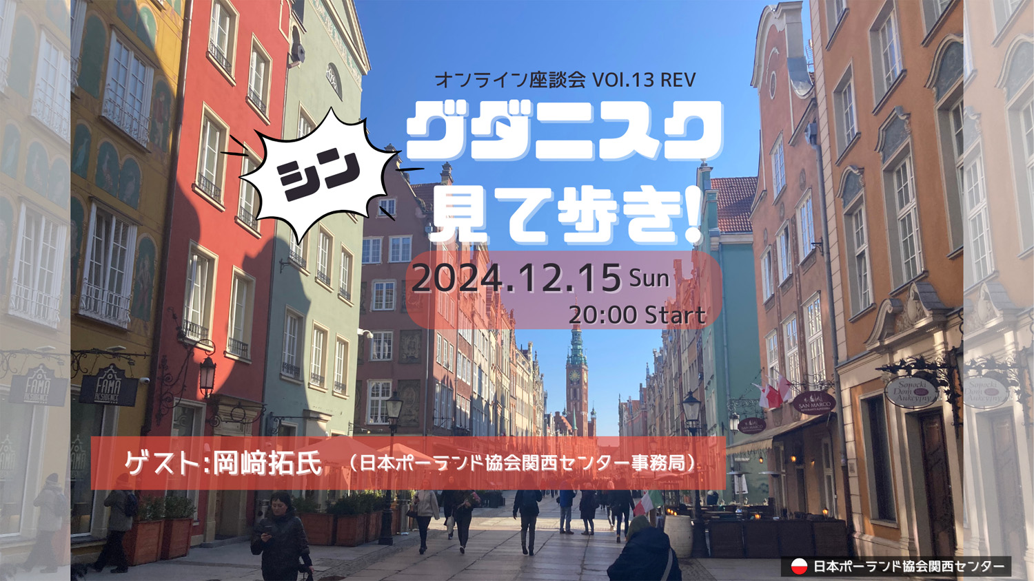 | 12⽉15⽇(⽇) ・オンライン座談会vol.13 REV 「 シン・グダニスク見て歩き !」 ゲスト︓ 岡﨑 拓さん(日本ポーランド協会関西センター事務局) Zoomミーティングによるオ ンライン開催 ★当日の様子はこちら ⇒ https://www.facebook.com/nippo.kansai/posts/pfbid02Zc3YTyFD9mWiAYq7fAQi8wviCRzaMA8qgT1Ki6VBCVvhxGLVnAAmScQjMDj9dGtHl |