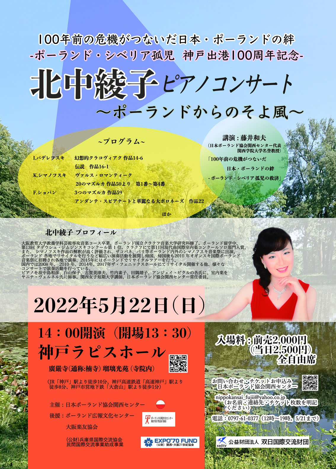 | 5月22日(日) ・100年前の危機がつないだ日本・ポーランドの絆 ーポーランド・シベリア孤児 神戸出港100周年記念ー 北中綾子ピアノコンサート~ポーランドからのそよ風~ 神戸ラピスホールにて ★当日の様子はこちら ⇒ https://www.facebook.com/nippo.kansai/posts/2569803773150950 <助成> ![]() |