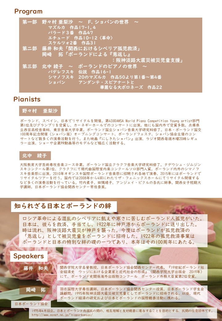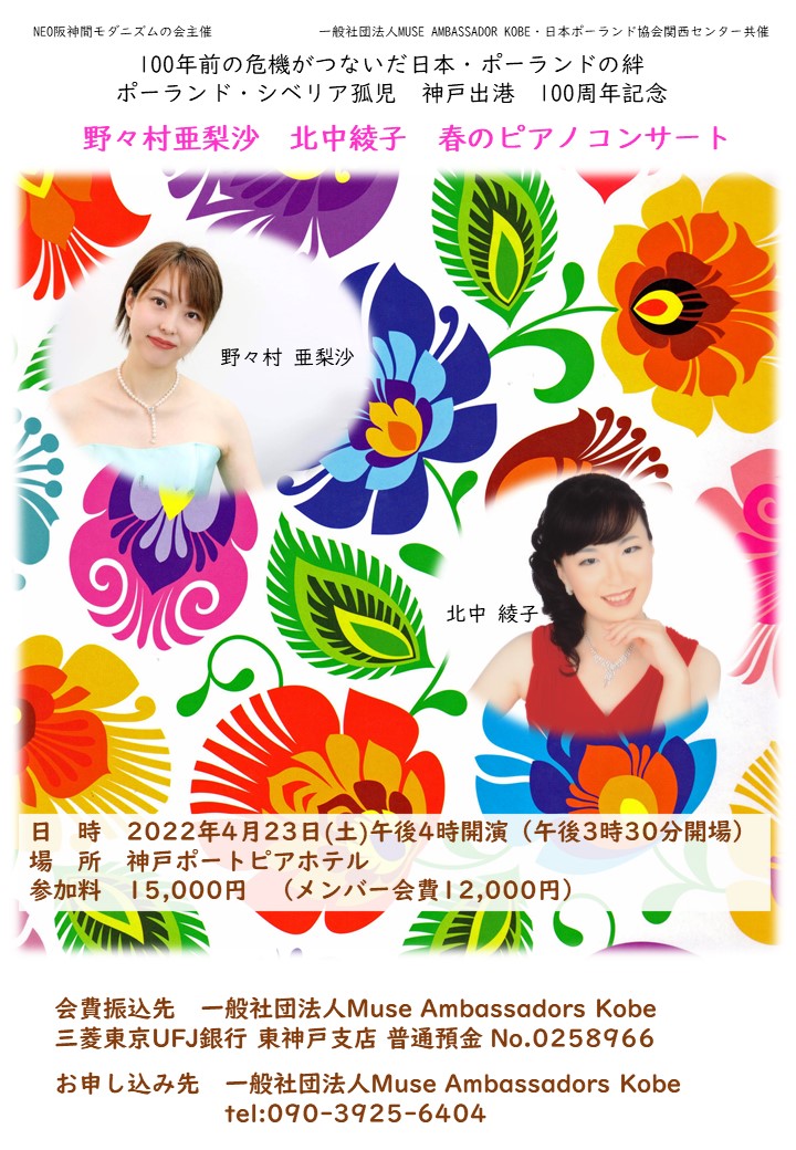 | 4月23日(土) ・NEO阪神間モダニズムの会主催 一般社団法人MUSE AMBASSADOR KOBE・日本ポーランド協会関西センター共済 「100年前の危機がつないだ日本・ポーランドの絆 ポーランド・シベリア孤児 神戸出港 100周年記念 野々村亜里沙 北中綾子 春のピアノコンサート」 神戸ポートピアホテルにて |