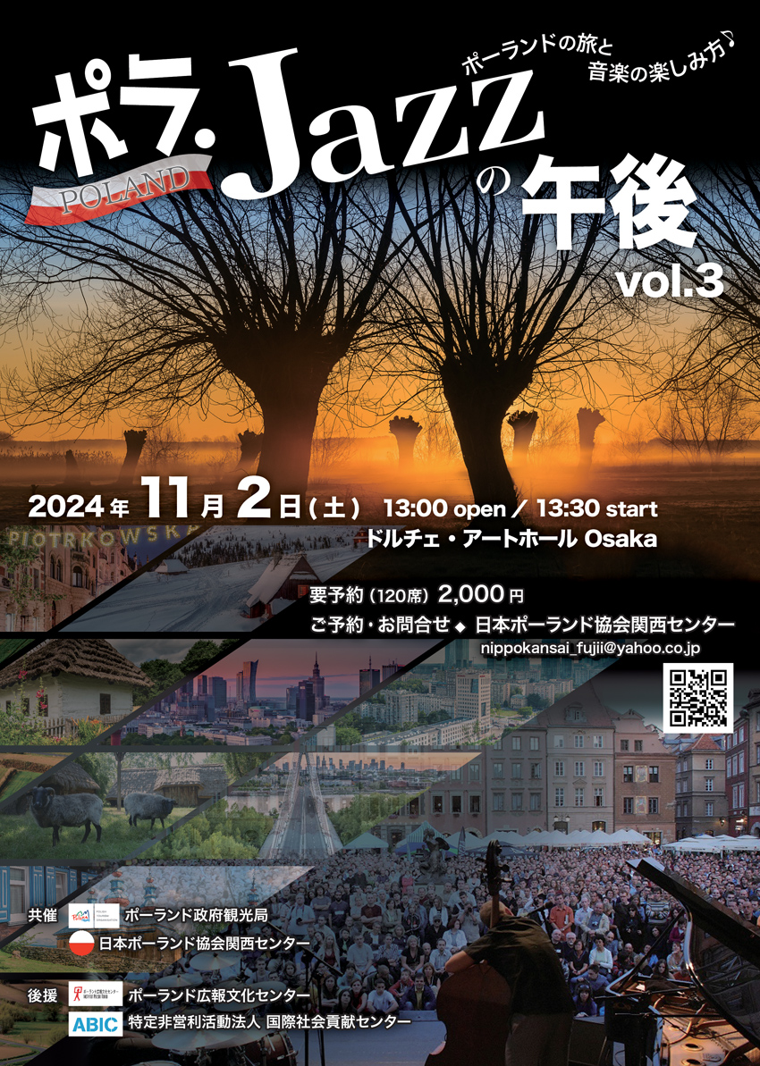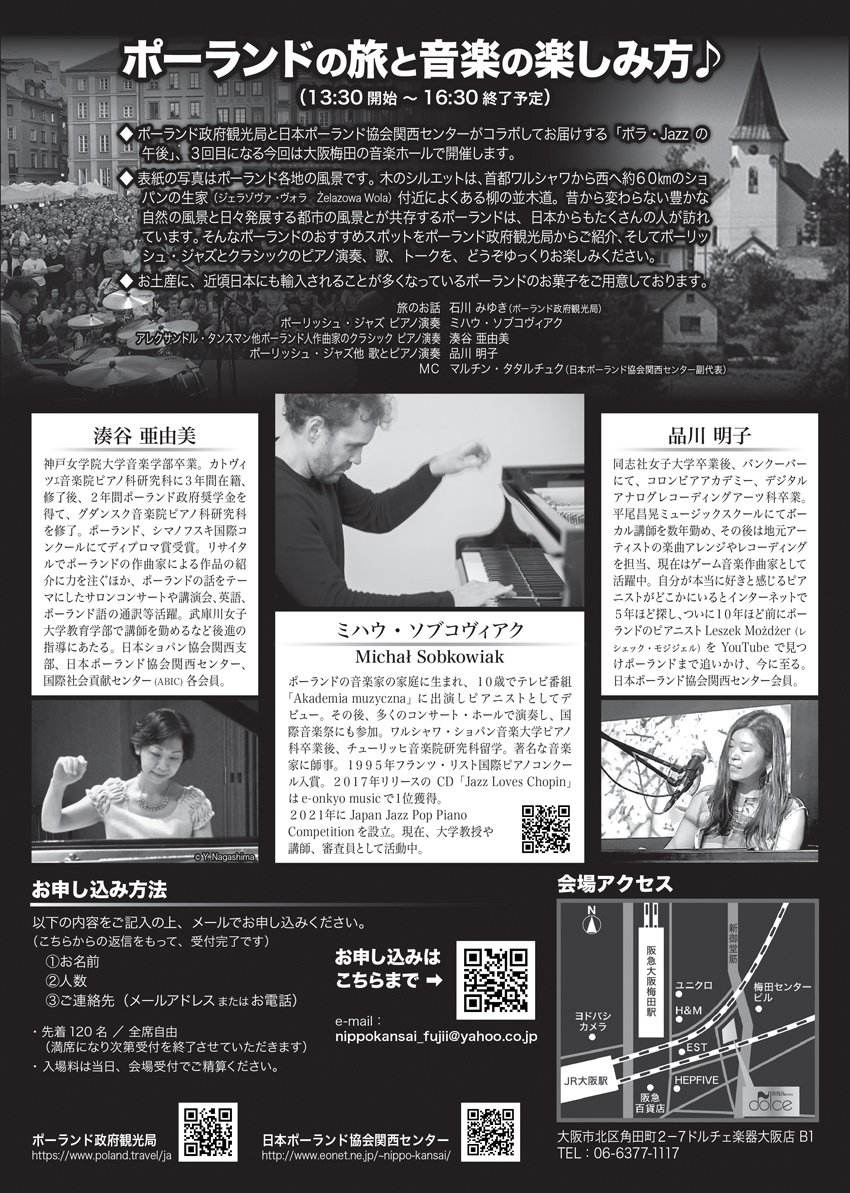| 11月16日(日) ・「ポラ・Jazzの午後 vol.4」 ポーランドの旅 冬とクリスマス♪ ポーランド政府観光局・日本ポーランド協会関西センター共催 ドルチェ・アートホール Osaka にて ★当日の様子はこちら ⇒https://www.facebook.com/nippo.kansai/posts/pfbid02J3NisESAZ2dwpjxXvzsWQduiznQpgCgpP91XfRUcz2at2oY6pTvFXpzZYrsdHi1Pl |