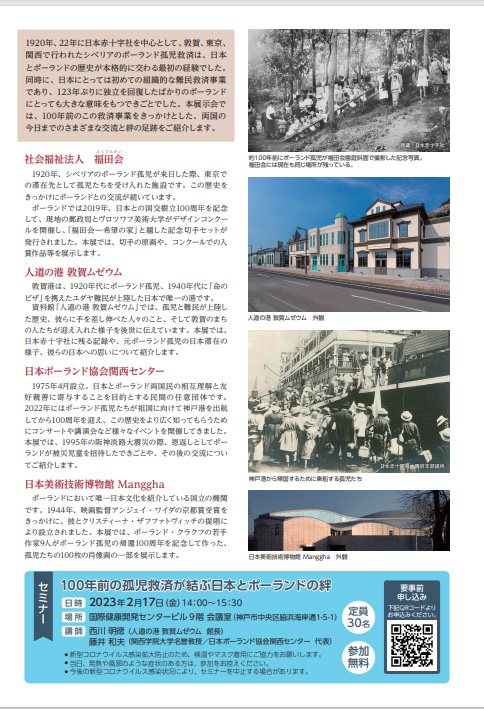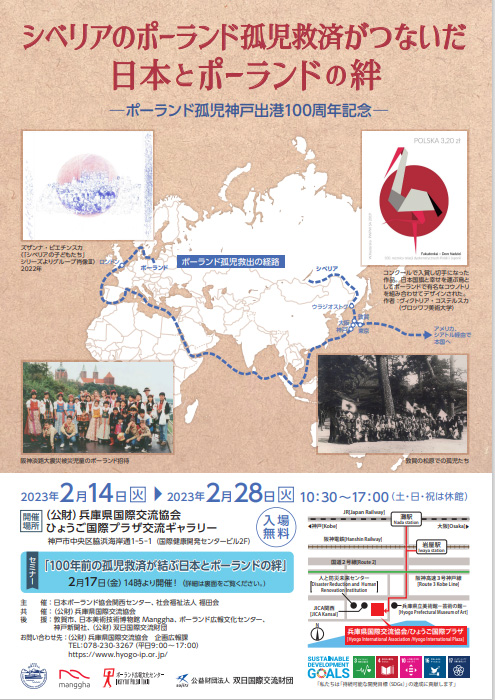 | 2023年2月14日(火)~2月28日(火) ・展示会 「シベリアのポーランド孤児救済がつないだ日本とポーランドの絆」 -ポーランド孤児神戸出港100周年記念- (公財)兵庫県国際交流協会 ひょうご国際プラザ交流ギャラリーにて 2月27日(金) ・セミナー 「100年前の孤児救済が結ぶにほんとポーランドの絆」 国際健康開発センタービル9階にて <助成> ![]() |
