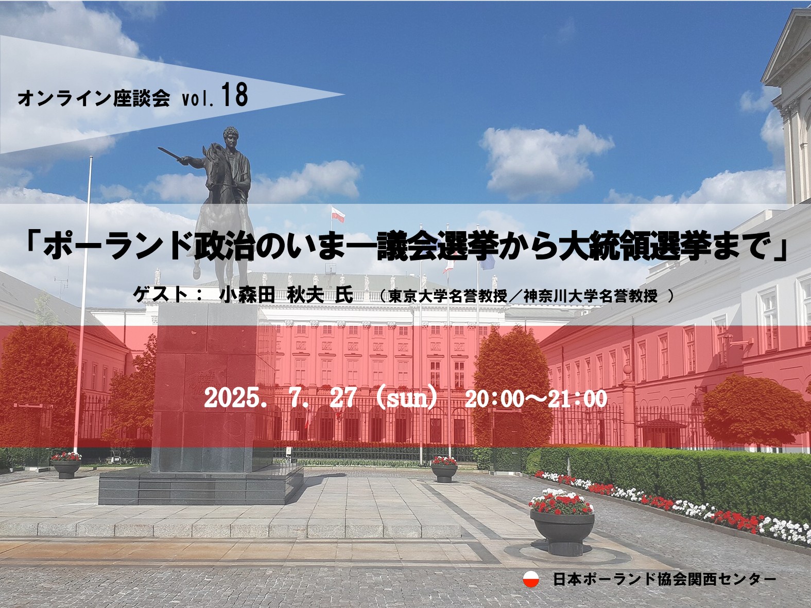 | 5⽉25⽇(⽇) ・オンライン座談会vol.18 「 ポーランド政治のいま—議会選挙から大統領選挙まで」 ゲスト︓ 小森田 秋夫 氏(東京大学名誉教授/神奈川大学名誉教授) Zoomミーティングによるオ ンライン開催 ★当日の様子はこちら ⇒ https://www.facebook.com/nippo.kansai/posts/pfbid0XRbS1b8SSchoyuckYkz3LYcqRHKwdKBBgQZEAHiBoqjv1ai1FA8YYjV5g8YKPmsyl |