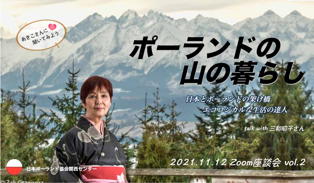 | 11月12日(金) ・オンライン座談会vol.2 「ポーランドの山の暮らし 昭子さんに聞いてみよう!」 ゲスト:三和 昭子 さん Villa Akiko 経営者 Zoomミーティングによるオンライン開催 |