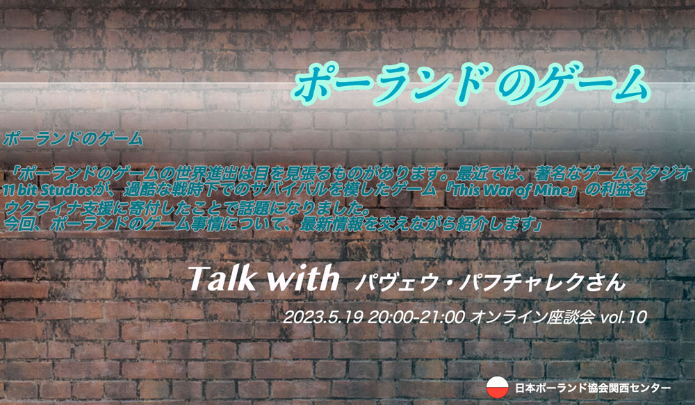 | 5月19日(金) ・オンライン座談会vol.10 「ポーランドのゲーム今」 お話し:パヴェウ・パフチャレク 当センター運営協力委員 司 会:加須屋明子 当センター副代表 Zoomミーティングによるオンライン開催 ★当日の様子はこちら ⇒ https://www.facebook.com/nippo.kansai/posts/pfbid02YLxVFJNf6M7 pgdv3crusy2SiR4NursBjr9NfxceEskrFczDvV3TmaCj38H6dy6Zol |