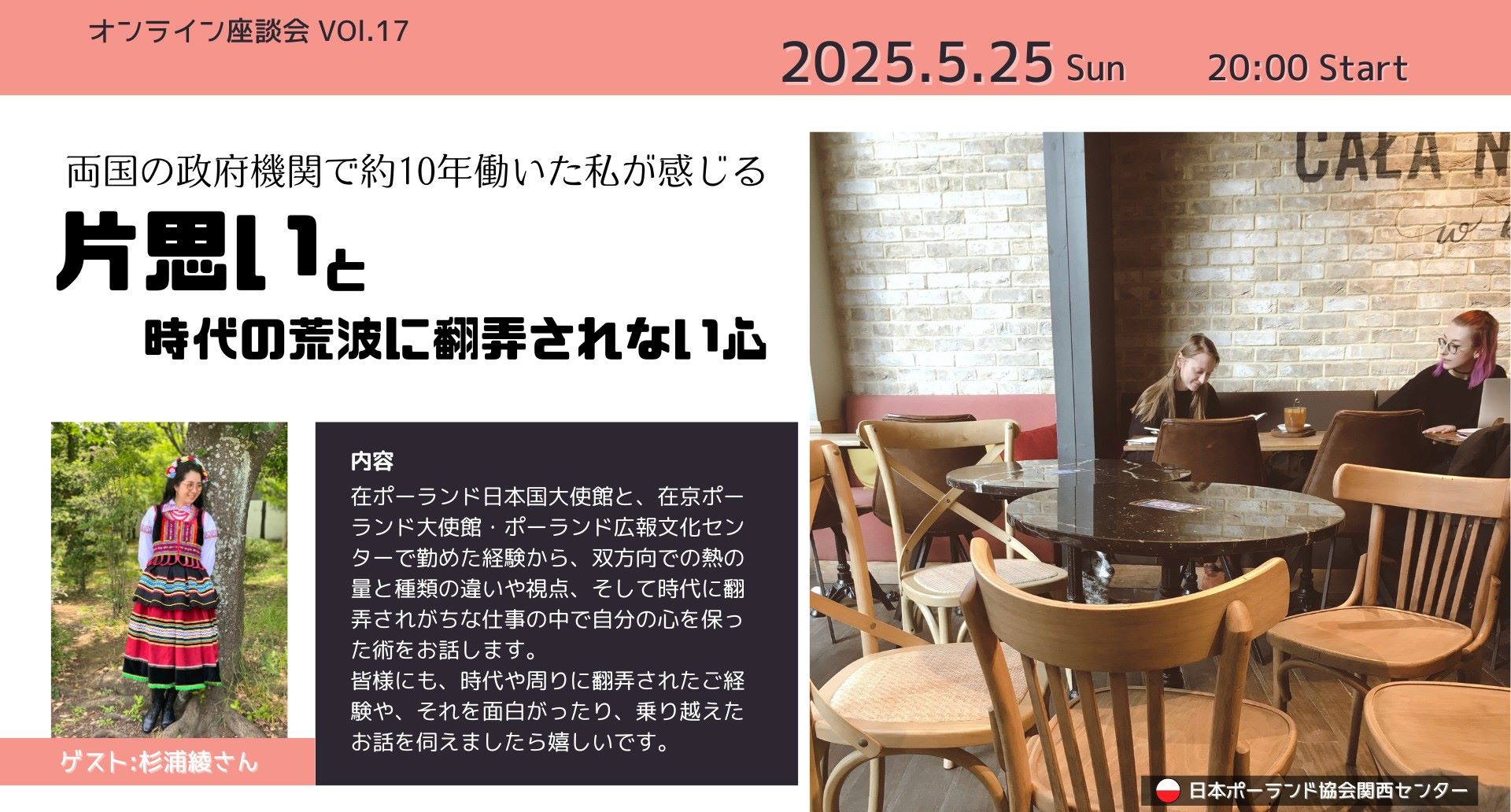 | 5⽉25⽇(⽇) ・オンライン座談会vol.17 「 両国の政府機関で約10年働いた私が感じる『 片思いと時代の荒波に翻弄されない心』」 ゲスト︓ 杉浦 綾さん Zoomミーティングによるオ ンライン開催 ★当日の様子はこちら ⇒ https://www.facebook.com/nippo.kansai/posts/pfbid02pJVoSWWwmZn9ysR8ZQpsRc616DByAPdhGaEE38gq1Eomz43G7eh3QWXZ2eW 2k74zl |
