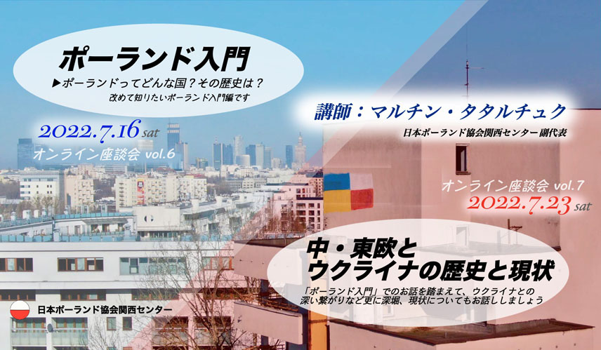 | 7月16日(土) ・オンライン座談会vol.6 「ポーランド入門」 お 話:マルチン・タタルチュク 当センター副代表 京都大学ほか非常勤講師 司 会:加須屋明子 当センター副代表 Zoomミーティングによるオンライン開催 ★当日の様子はこちら ⇒ 座談会6報告 7月23日(土) ・オンライン座談会vol.7 「中・東欧とウクライナの歴史と現状」 お 話:マルチン・タタルチュク 当センター副代表 京都大学ほか非常勤講師 司 会:加須屋明子 当センター副代表 Zoomミーティングによるオンライン開催 ★当日の様子はこちら ⇒ 座談会7報告 |