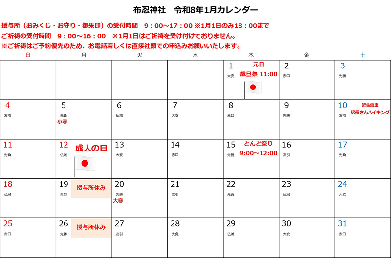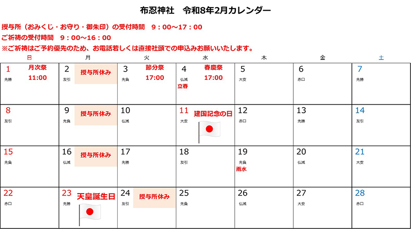 月曜日が、祝日又は祝日代替え休み・1日・15日の月次祭の時は次の火曜日が代替え休日となります。