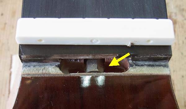 | 上駒を外すとネックに溝が入っていて、そこの六角ナットがありました 見る限りトラスロッドの調整ナットに見えるのですが… クラシックギターなどナイロン弦ギターのネックには調整式のトラスロッドが入っていることは少なく、一部のエレガット機種で見られるくらいで、そう云った場合もサウンドホール部分に調整穴があったり、ヘッドにトラスロッドカバーが付いていたりして調整式のトラスロッドが入っている事が分かり易くなっていますが、こんな風に上駒を外さないと分からないような所に付いているのは見た事がありません しかも高級クラシックギターなどでは上駒は嵌め込み式で接着されていない事が多いのですが、このヤマハCG182Sの上駒はネックに接着されていて上駒交換でもしない限りその存在に気がつきません 今回の修理内容とは関係無い事ですが気になって仕方ないので調べてみました まずヤマハのサイトを見てみましたが該当機種にトラスロッドが入っていて反り調整が出来ると云ったような内容は見つけられませんでした ネット検索もしてみましたがこれも該当する記事は見つかりませんでした とりあえずこの六角ナットを回してみれば何か分かりそうなので、試しに少し緩めさせてもらう事に。 もちろん六角ナットが固ければあきらめるつもりで軽〜い力で六角ナットを緩めると…動きました! ネックの状態を見ると、わずかですがさっきよりも順反りが大きくなっています そこで元の位置まで六角ナットを戻すと、ネックの反りも元の状態に戻りました! やはりこれはトラスロッドの調整ナットだったのです! ヤマハのクラシックギター、少なくともCG182Sではトラスロッドで反り調整をする事が出来るんです この依頼品は新品だったのでマニュアルや付属品も一緒に送られてきたのですが、調整スパナも付属されていませんし、調整するにもギターにダメージを与えないように上駒の接着を外し、調整後にまた接着する必要があるのでユーザーさんには難しい事なのですが、なぜこれをマニュアルに明記しないのか?不思議です 恐らくヤマハのアフターサービス内では周知されているのだとは思いますが、ユーザー自身も知っておいた方が良いと思うし、我々メーカー外の修理業者も知らされていた方が良いと思うんです 通常クラシックギターのような調整式のトラスロッドが入って居ないネックの反り修正は、フレットを抜き指板を削って反りを修正する方法と、ネック用の「アイロン」と呼ばれる工具で熱を掛けて矯正する方法があり、指板を削る方法ですと上駒を外してから削りますのでその時点でこの六角ナットの存在に気が付きますが、アイロンを使用する方法ですと六角ナットの存在に気が付かないままアイロンを掛けて修理してしまいそうです 当店ではアイロンを使用する方法は行いませんが一般には1万円前後の工賃が掛かるようですのでトラスロッド調整よりは費用が掛かります ちなみに当店でトラスロッド調整をした場合、上駒の取り外し・再接着を含めても4,000円の工賃ですので6,000円ほど無駄な費用を使ってしまう事になりますね リペアマンが調整式のトラスロッドが入っている事を知らなくても、ユーザーさんが知っていれば修理時にリペアマンに伝えられる事ですし、知っていて損は無い情報だと思います なのに上駒(ナット)と云う隠しトビラに隠すなんてねぇ〜 |