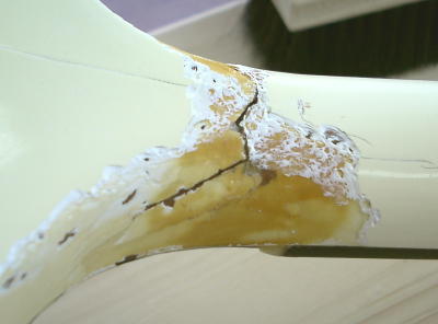 | ファイアーバードのネック折れなのですが・・ 塗装がなにやら怪しいので接着する前に剥がしてみる (本来は接着した後に周りの塗装を剥がします) と下からこんなモノが・・・ どうも一度ネック折れ修理した所からまた折れてしまった (と言うか剥がれてしまった)ようですが 普通なら接着後、修理箇所の周辺の塗装を剥がしてから再塗装をするのですが このファイアーバードはそのまま、接着面からはみ出した接着剤もそのまま 上から再塗装されたようで表面の塗装を剥がすと垂れた接着剤が 化石を発掘するがごとくそのままの形で現れました! で、この黄ばみは恐らくアロンアルファなどのシアノアクリレート系の接着剤で 元の塗装のラッカーが黄変したモノと思われます しかもその上からラッカーホワイトを厚塗りして平らにするという暴挙に出ています! それにしてもこれだけ荒っぽい事をしているのになぜだか色合わせが上手い・・・ 白系の色合わせはかなり難しいのに元の色との境目が分からない! この修理、ヘタなんだかウマイんだか・・・ |