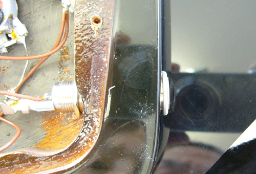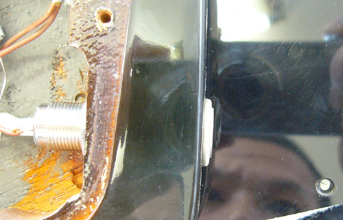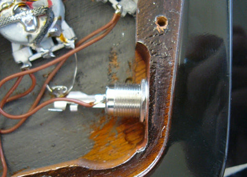 当然こんなふうにジャックが歪みガクガクしています ジャックがガクガクして遊びがある為、プラグを差し込むと余計にグラグラして その為にジャック内部の接触不良を起こしガリが出ます ○ブソンのサンダーバードは全部この位置にジャックが付いているワケじゃないと思うのですが… 何らかの事情があって本来の位置からずらす必要があったか 毎回適当な位置に穴あけしているのか… |