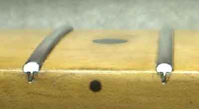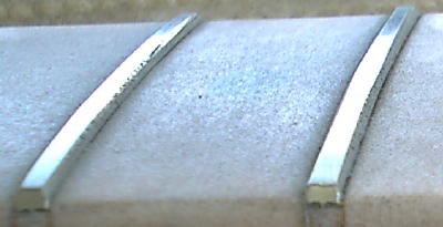 | 弦を張った状態と同じようになるようにネックにテンションをかけて摺り合わせしましたが 逆反りのために中央付近(9フレット前後)はこのようにペッタンコ せっかくにジャンボフレットがこれじゃぁねぇ (摺り合わせ作業のために指盤面にはマスキングテープを貼っています) |