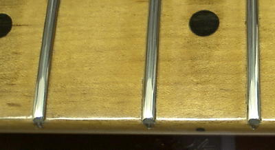 | 仕上がりの写真です フレットの足の部分をよ〜く見ると整形前の写真と同じフレットであることが分かると思います (フレット足の仕上げはオーナー様のDIYですので私の仕事ではありません!!!) ペッタンコになったフレットはヤスリで角を丸めて整形します 当店ではフレット用のU溝のヤスリは使いません フレット一本一本の状態に合わせて適切な整形をするために 普通の目立てヤスリで作業します 見た目を良くするためでもありますが、平たいままのフレット面では ピッチが不安定になったり指が引っかかったりチョーキングがし辛いと云った事が起きます 結構大事なことなんですよ! フレット交換やナット交換は一般の方が思われてる以上に難しい作業です 「チャレンジしてみたい!」と云う気持ちは分かりますが 大切なギターならプロに任せましょう〜 |