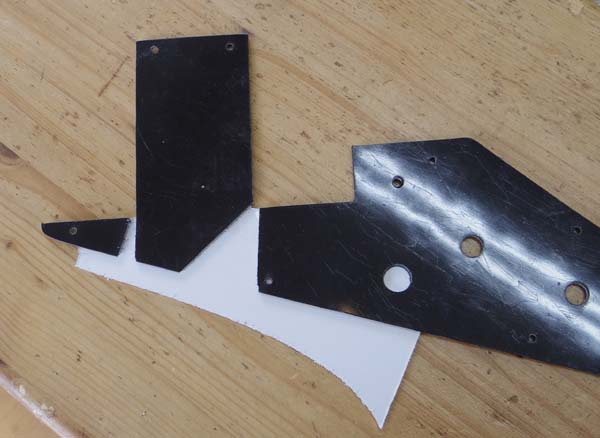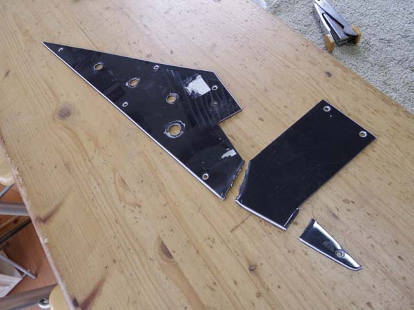 | この様な有様です これはもう割れたと言うよりグイ〜っと曲げてゴキッっと折ってバチンッっと引きちぎった様な感じです 一体何があったんでしょう??? 普通の人間なら余程の癇癪を起こさない限りこんな事はしないでしょうが,ピックガードがギターに付いたままではこんな事は出来ないのでギターから外してやったらしき行動は癇癪とは繋がらない冷静さと言うか… 想像するにポットとかジャックとかの電気パーツを自分で交換しようとピックガードを外したは良いが手に負えない事に気が付き 自分の不甲斐無さにキィー!!!!!っとなって起こしてしまった行動では無いでしょうか? 想像は尽きませんが、はてさてどう作り直すか… ピックガードを作り直す時は通常 元のピックガードを「型」にしてそれをなぞる様に削り出して製作するのですがこれは引きちぎった時にプラスティックが延びて変形し形を成していません 「工賃は高くなりますけどこれは元の型から作り直さないとなぁ…」とお客さんと話していてふと気が付きました 変形した部分を切り取ってから組合せば「型」に出来る! という事で普通のピックガード作り直し工賃にちょっとプラスの工賃でお受けしました 具体的にどうやるかも言いますと、こんな感じ↓ |
