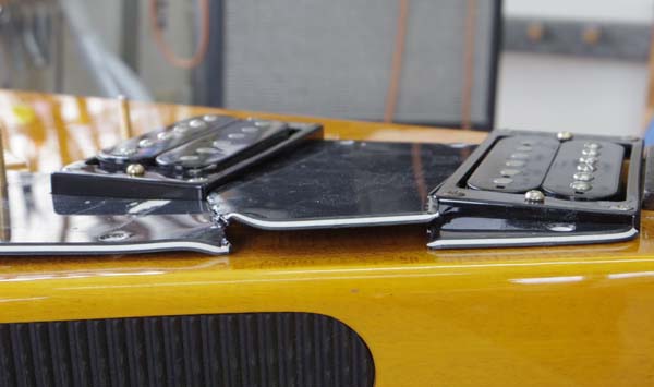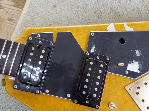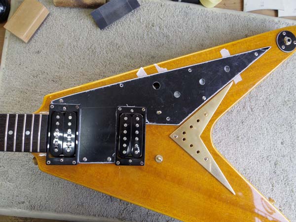 | 元のピックガードがこんな事になっていたからです とりあえずギターにのせてみたところ… |