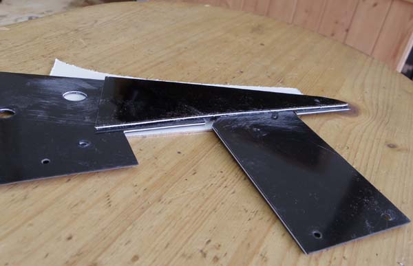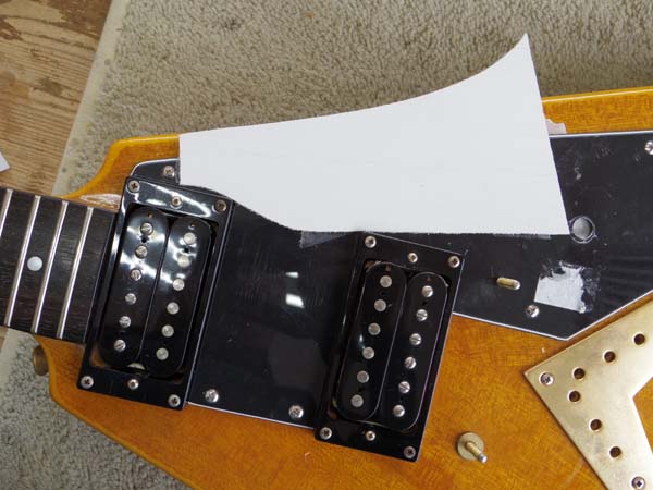 | ギターから取り外し裏側に別の板を貼り付けます はじめの白い板は両面テープで貼りましたが今回は瞬間接着剤でしっかり貼り付けます |