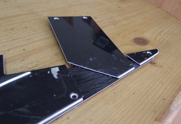 | 切り取った部分を繋ぐようにピックガード表面に何らかの板を両面テープで貼り付けます 今回はピックガード板の端材を貼り付けました ピックガードの製作で出た端材はこう云う時に役立つのでストックしています |